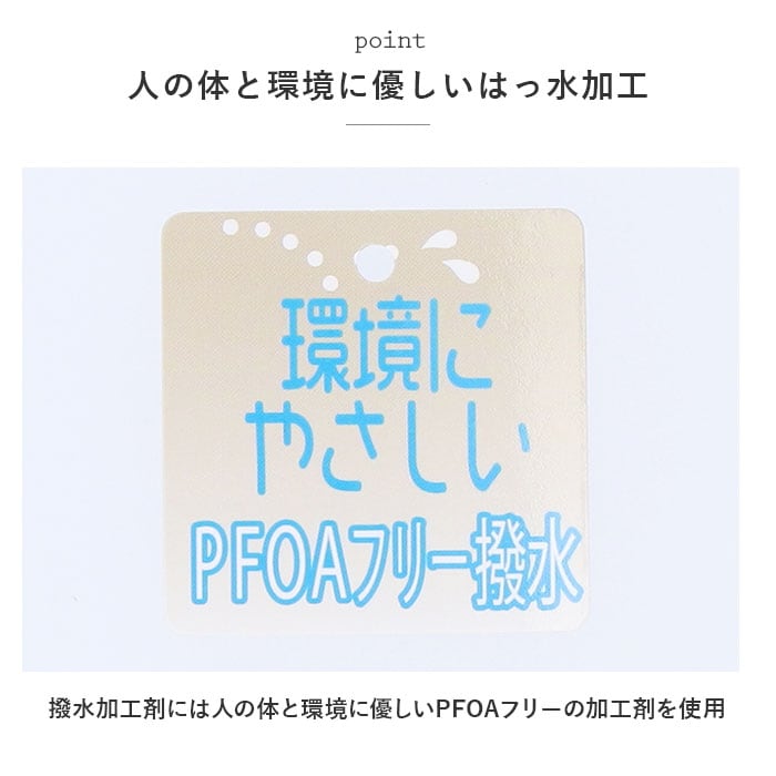 ・撥水加工剤には人の体と環境に優しいPFOAフリーの加工剤を使用。