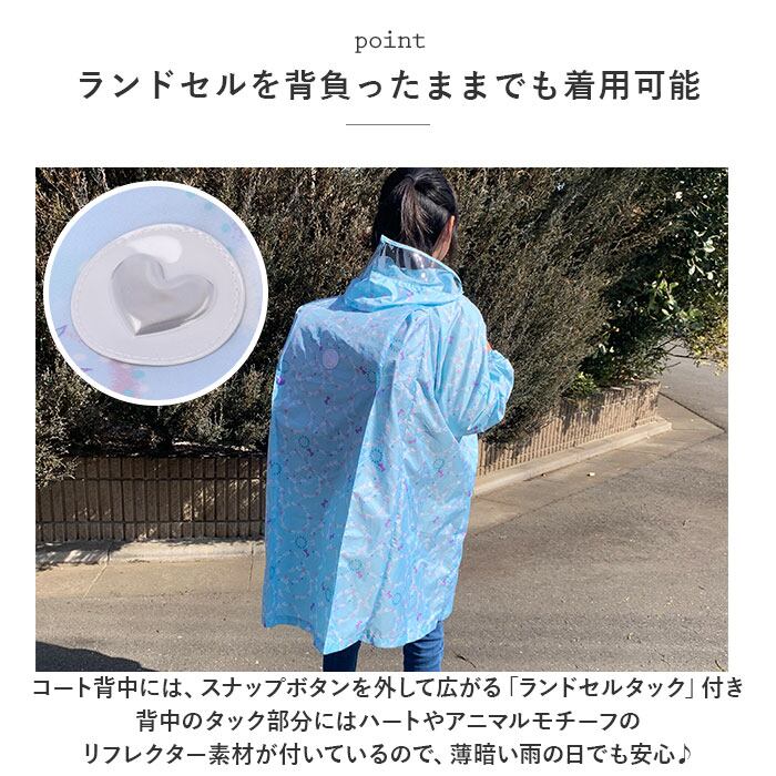 ・自動車のライトにピカッと光る☆背中のタック部分にはハートやアニマルモチーフのリフレクター素材が付いているので、薄暗い雨の日でも安心♪