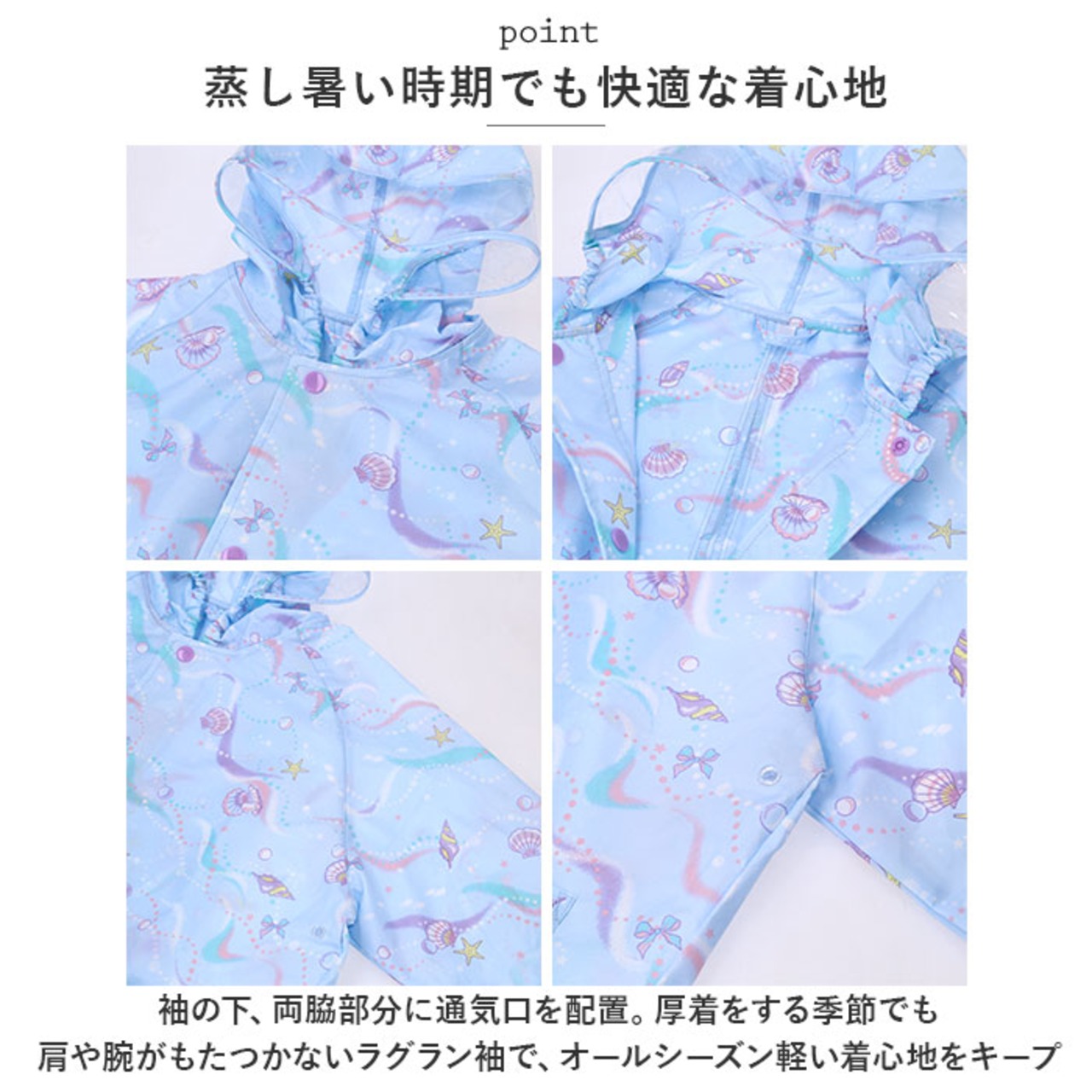 ・袖の下、両脇部分に蒸し暑い時期でも快適な通気口を配置。さらに、厚着をする季節でも肩や腕がもたつかないラグラン袖のデザインにすることで、オールシーズン軽い着心地をキープ。