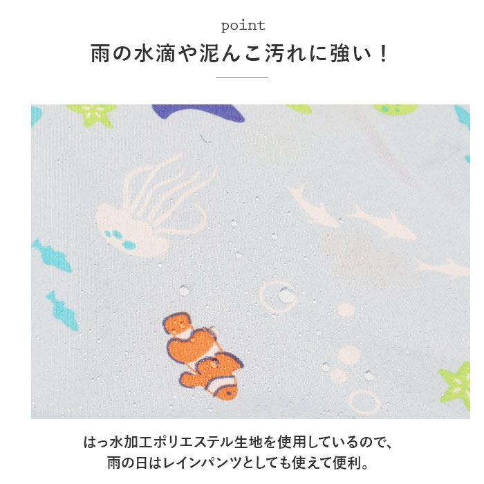 ・雨の水滴や泥んこ汚れに強い、はっ水加工ポリエステル生地を使用しているので、雨の日はレインパンツとしても使えて便利。