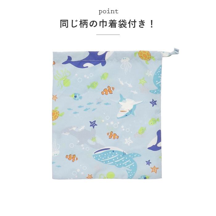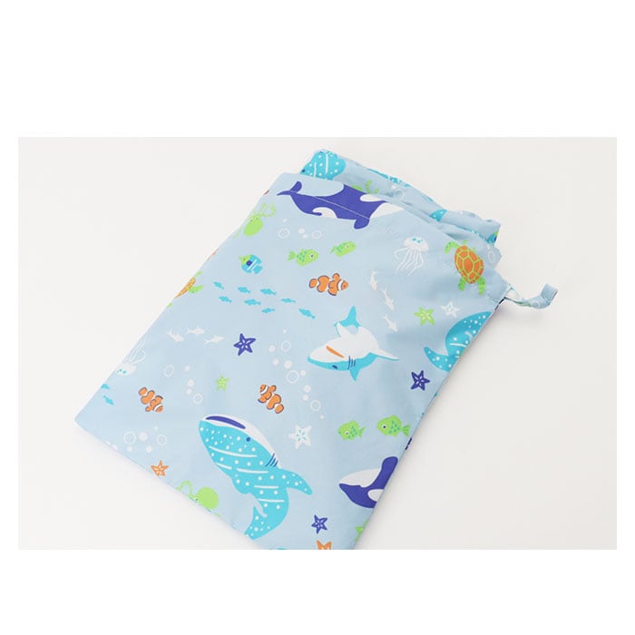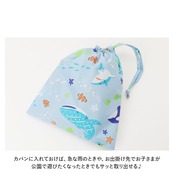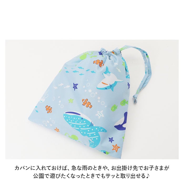 ・プレイウェアの生地と同じ柄の巾着袋付き!ママのカバンに入れておけば、急な雨のときや、お出掛け先でお子さまが公園で遊びたくなったときでもサッと取り出せる♪
