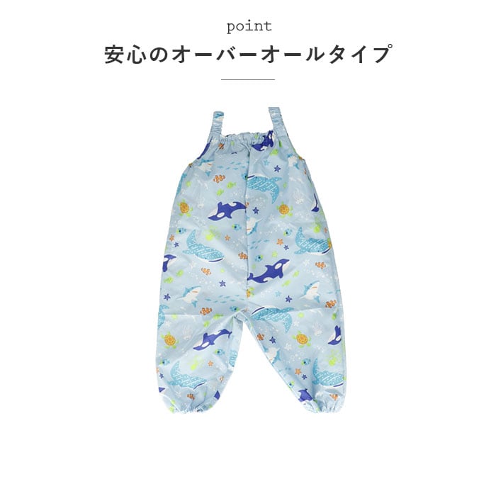 ・胸元までしっかりと覆ってお洋服が汚れにくい、安心のオーバーオールタイプ。