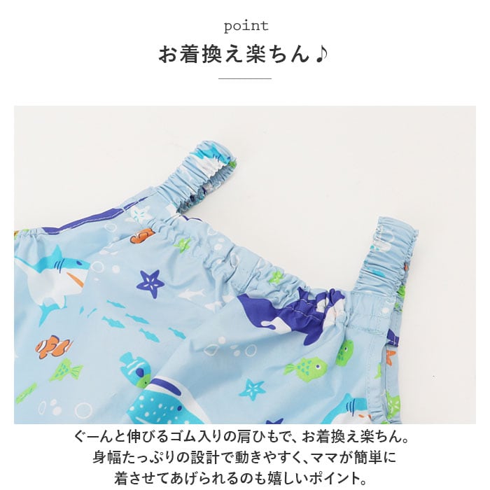 ・ぐーんと伸びるゴム入りの肩ひもで、お着換え楽ちん。身幅たっぷりの設計で動きやすく、ママが簡単に着させてあげられるのも嬉しいポイント。