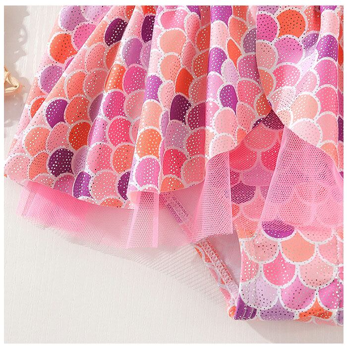・人魚を彷彿させるようなマーメイド柄と、背中から胸元のフリルやバッククロスがセクシーな印象で、大人顔負けのお洒落なデザイン。