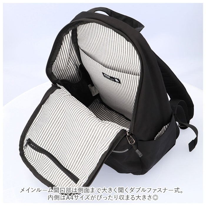 ・メインルーム開口部は側面まで大きく開くダブルファスナー式。