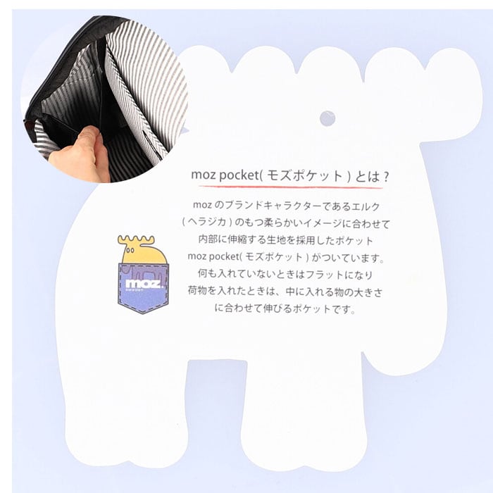 ・mozのトレードマーク「エルク」(ヘラジカ)のイラスト入りブランドロゴや合皮素材のタグなど、細部にもこだわりを詰めたアイテム。
