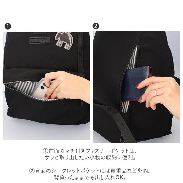 ・背面のシークレットポケットには貴重品などをIN。背負ったままでも出し入れOK。