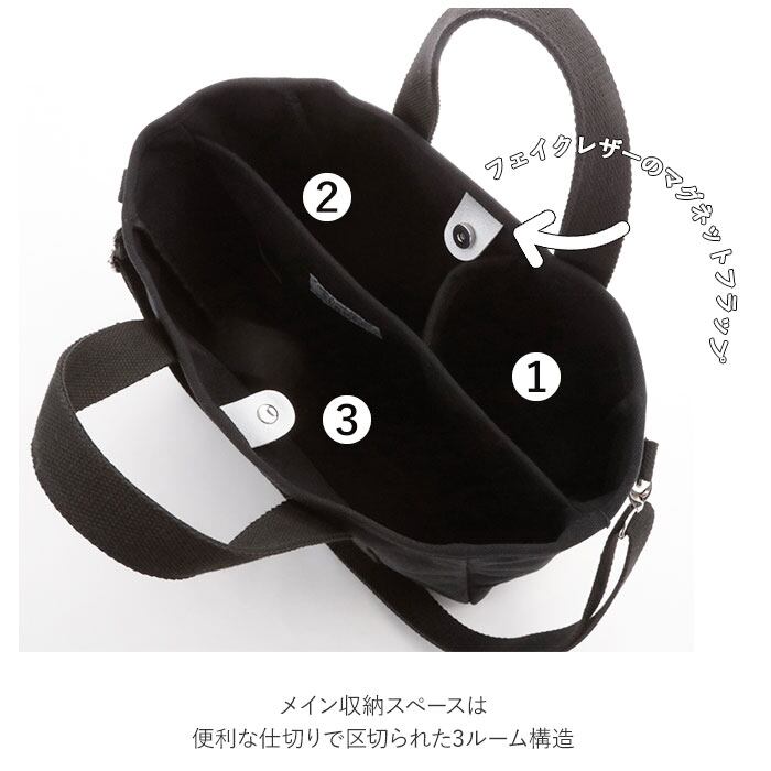 ・バッグの開口部は、フェイクレザーのマグネットフラップで、パチンッと留められる!小物が飛び出さないので安心。