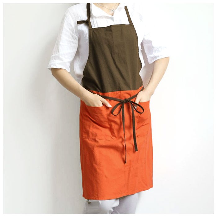 ・シンプルなデザインながらも、ウエストで切り替えた配色が目をひくエプロン。