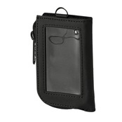 ・背面のファスナーポケットはビニール素材で中が見える仕様で、車のスマートキーを入れたまま操作できる。