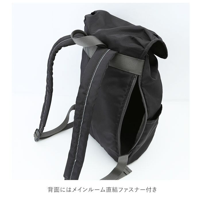 ・女性に使いやすい程よいサイズ感が魅力のフラップリュック。フラップを開いたメイン開口部は、小物の出し入れがしやすい巾着仕様。