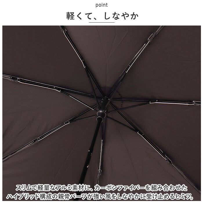 ・スリムで軽量なアルミ素材に、カーボンファイバーを組み合わせたハイブリッド構成の親骨パーツが強い風をしなやかに受け止めるヒミツ。