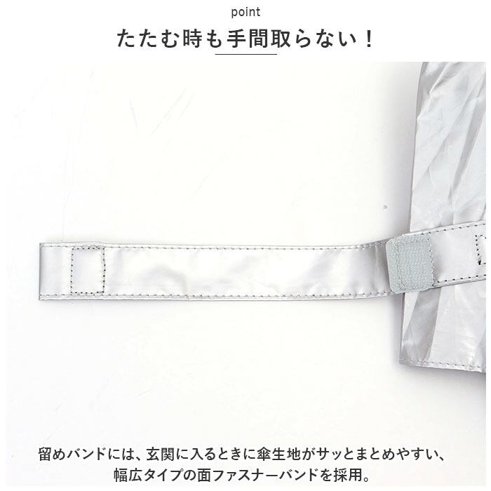 ・留めバンドには、玄関に入るときに傘生地がサッとまとめやすい、幅広タイプの面ファスナーバンドを採用。