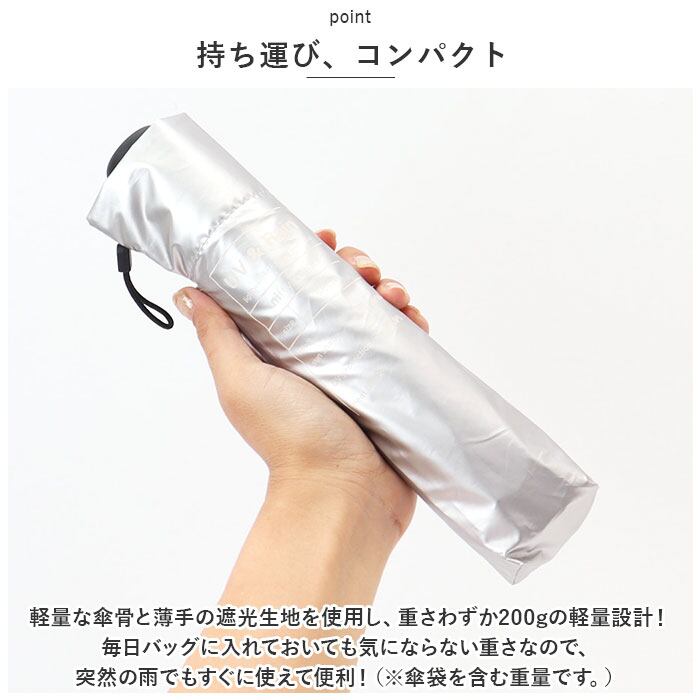 ・軽量な傘骨と薄手の遮光生地を使用し、重さわずか200gの軽量設計!毎日バッグに入れておいても気にならない重さなので、突然の雨でもすぐに使えて便利!(※傘袋を含む重量です。)