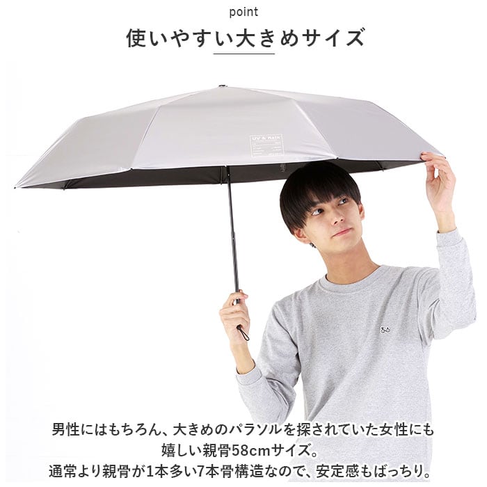 ・男性にはもちろん、大きめのパラソルを探されていた女性にも嬉しい親骨58cmサイズ。通常より親骨が1本多い7本骨構造なので、安定感もばっちり。