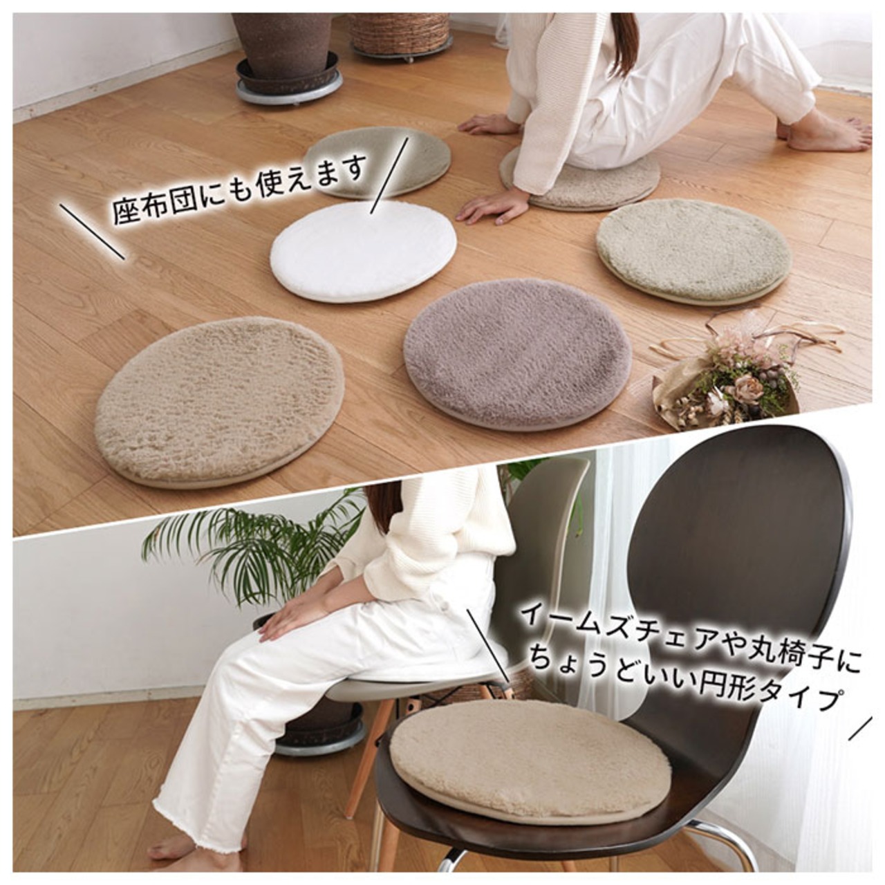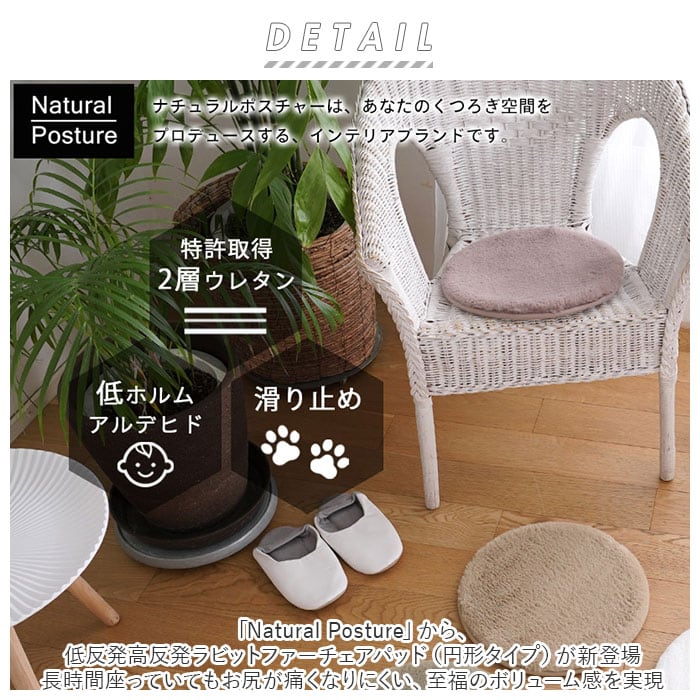 ・ふわふわのラビットファー×低反発+高反発2層ウレタンが奏でるハーモニー♪「Natural Posture」から、低反発高反発ラビットファーチェアパッド(円形タイプ)が新登場。