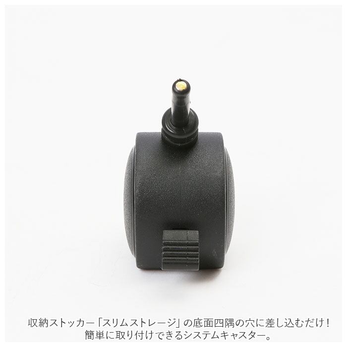 ・収納ストッカー「スリムストレージ」の底面四隅の穴に差し込むだけ!簡単に取り付けできるシステムキャスター。