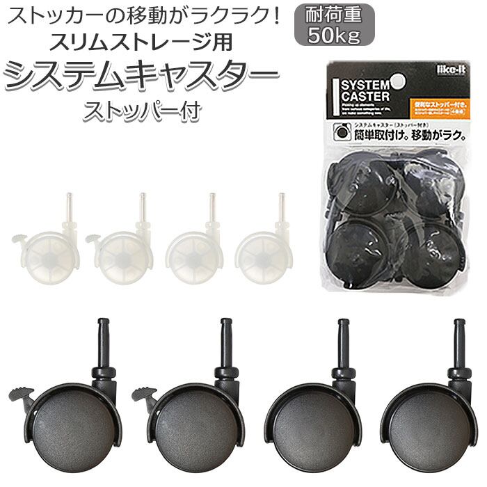 隙間収納 キャスター ストッパー付き 通販 ライクイット like-it スリムストレージ用 システムキャスター ストッパー付 CS-P9 すきま収納 部品 パーツ 取り付け簡単 差し込むだけ 収納ケース リビング キッチン 冷蔵庫横 シンク横 洗面所 ランドリー 洗濯機横 洗濯機横