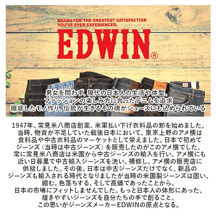1961年に日本で初めて国内縫製のブルージーンズを誕生させた「EDWIN」。創業から現在に至るまで、永遠の定番「EDWIN 503」を始め、時代と共に進化し続けるNo.1デニムブランド。