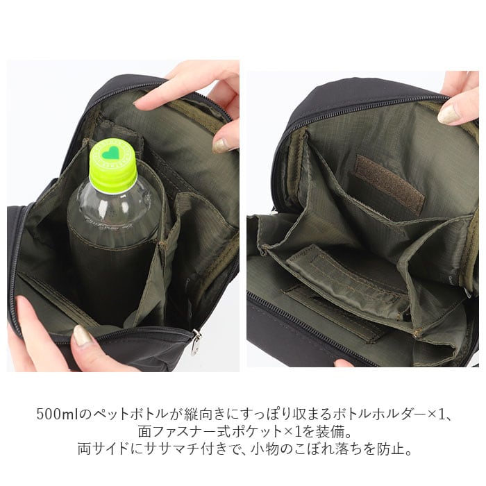 ・カードポケット×5、面ファスナー式ポケット×1、面ファスナー式フラップポケット×1、500mlのペットボトルが縦向きにすっぽり収まるボトルホルダー×1を装備。