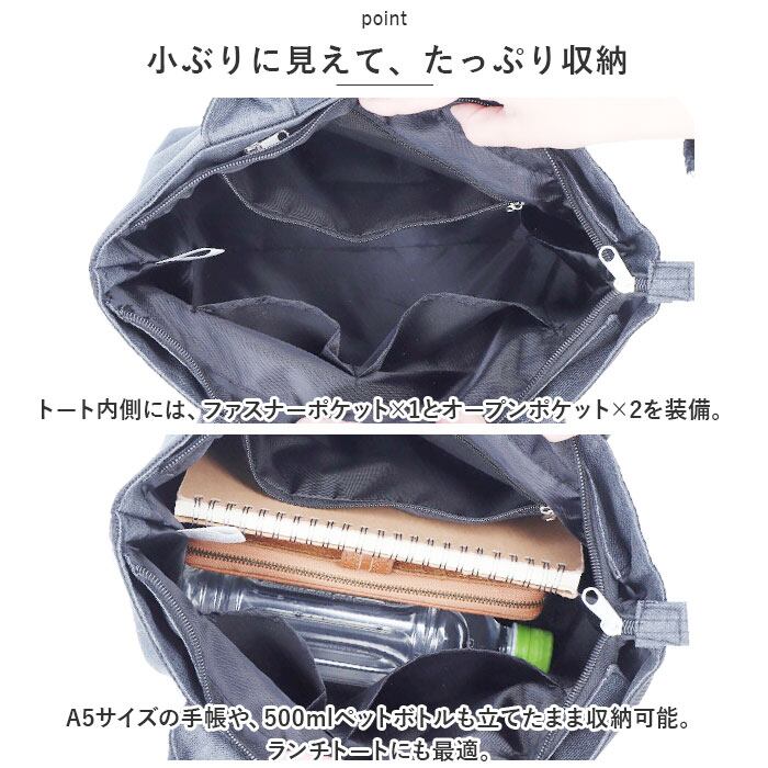 ・A5サイズの手帳やiPad miniのようなタブレット、500mlペットボトルも立てたまま収納可能。コンパクトながらもたっぷりのマチで、ランチトートにも最適。