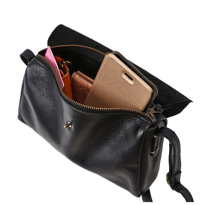 ・フラップを開けると、ビンテージ感のあるファスナー式の開口部。収納内部は折り財布やスマートフォンなど、最低限の小物だけを収納するのに適したサイズ感。