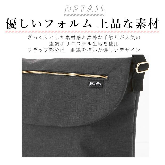 ざっくりとした素材感と素朴な手触りが人気の杢調ポリエステル生地を使用した、anello GRANDEの定番スタイル、メッセンジャーバッグの登場です。マグネットボタンでラクに開閉できるフラップ部分は、曲線を描いた優しいデザイン。ゴールドのファスナー金具が上品さを感じさせるワンポイントになっており、パスケースなどを収納するのに便利♪