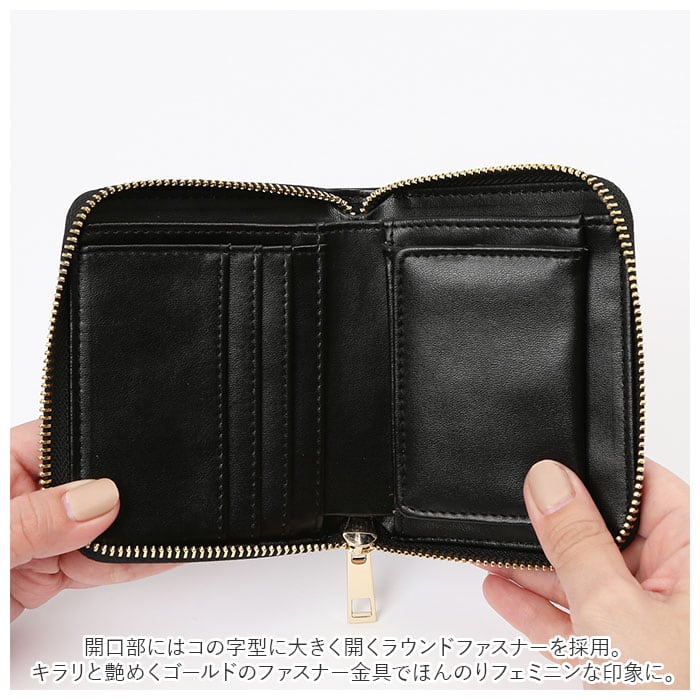 ・開口部にはコの字型に大きく開くラウンドファスナーを採用。キラリと艶めくゴールドのファスナー金具でほんのりフェミニンな印象に。