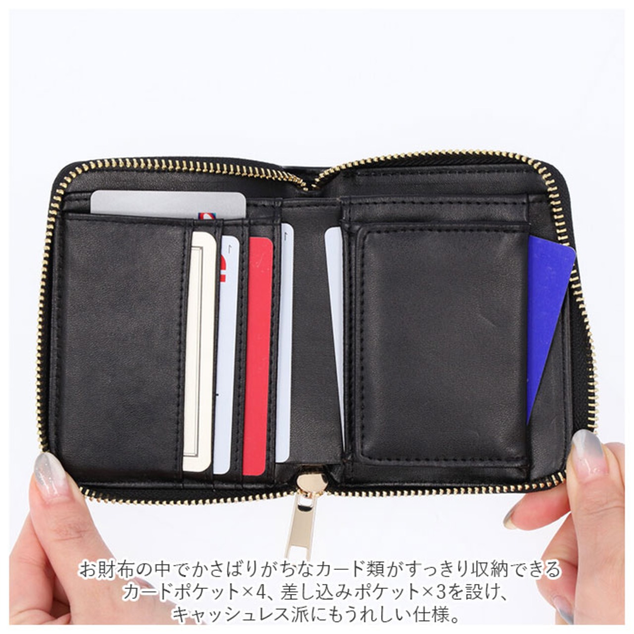 ・お財布の中でかさばりがちなカード類がすっきり収納できるカードポケット×4、差し込みポケット×3を設け、キャッシュレス派にもうれしい仕様。