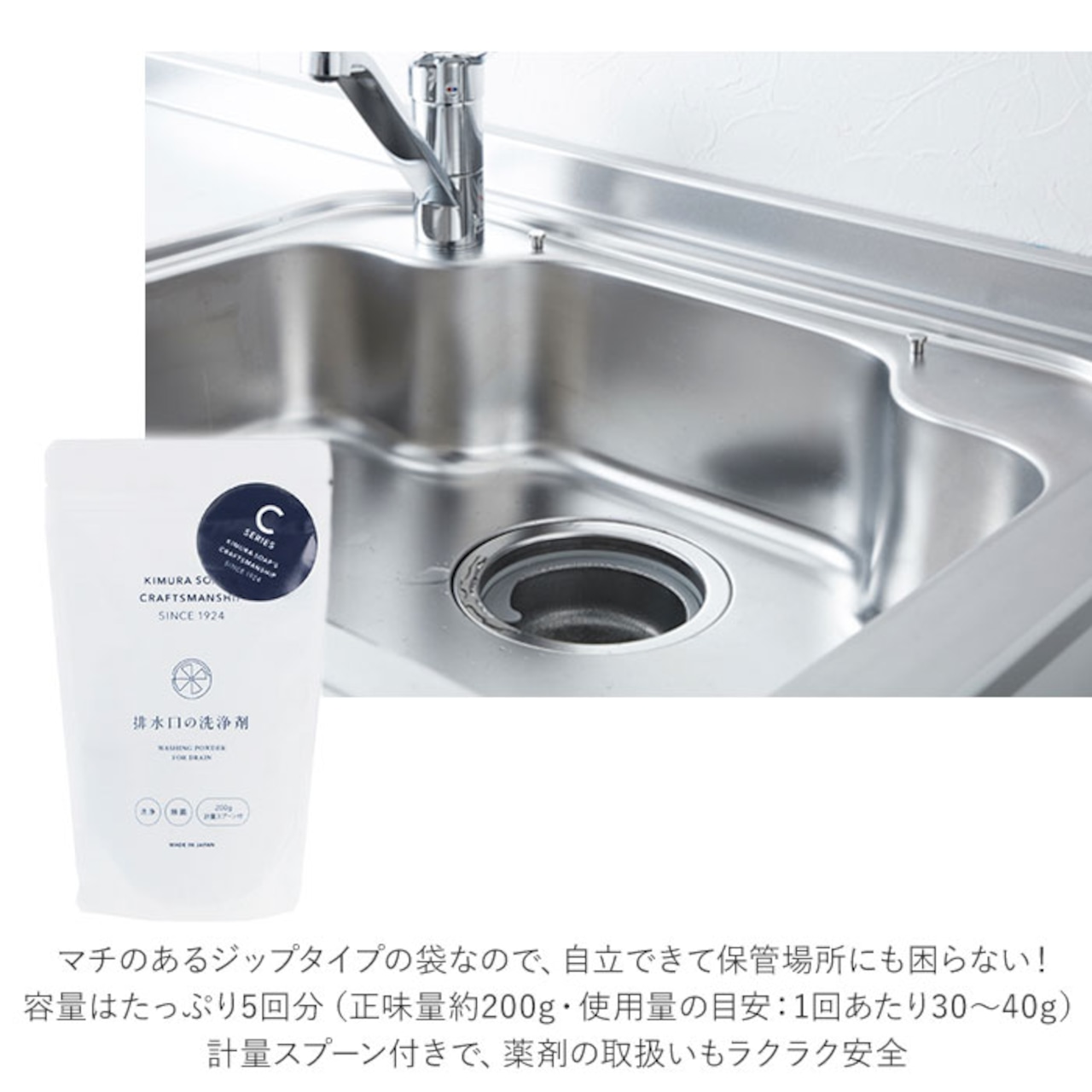 1.30g〜40g(軽量スプーン3〜4杯分)を排水口に入れ、40度程度のぬるま湯をコップ1杯程度(約200ml)入れてください。
