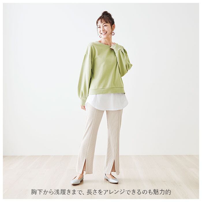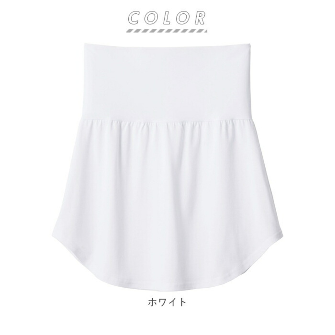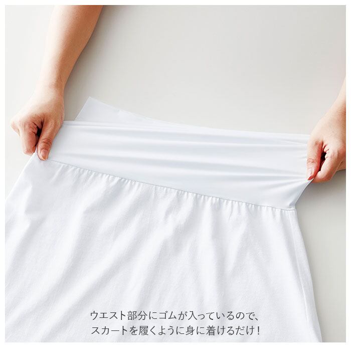 ・ウエスト部分にゴムが入っているので、スカートを履くように身に着けるだけ!レイヤードを楽しみながら、気になるお尻やお腹まわりをカバーしてくれる♪