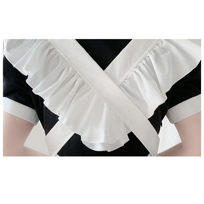 ・黒の無地ワンピースにフリルエプロン、カチューシャが付いておりオーソドックスなメイド姿を楽しめるアイテム。