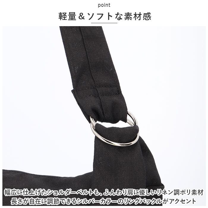 ・幅広に仕上げたショルダーベルトも、ふんわり肩に優しいリネン調ポリ素材。長さが自在に調節できるシルバーカラーのリングバックルがアクセント。