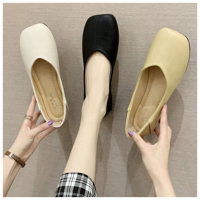 ・フォーマルにもカジュアルにも合わせやすい。つま先スクエアシルエットのVカットローヒールパンプス。