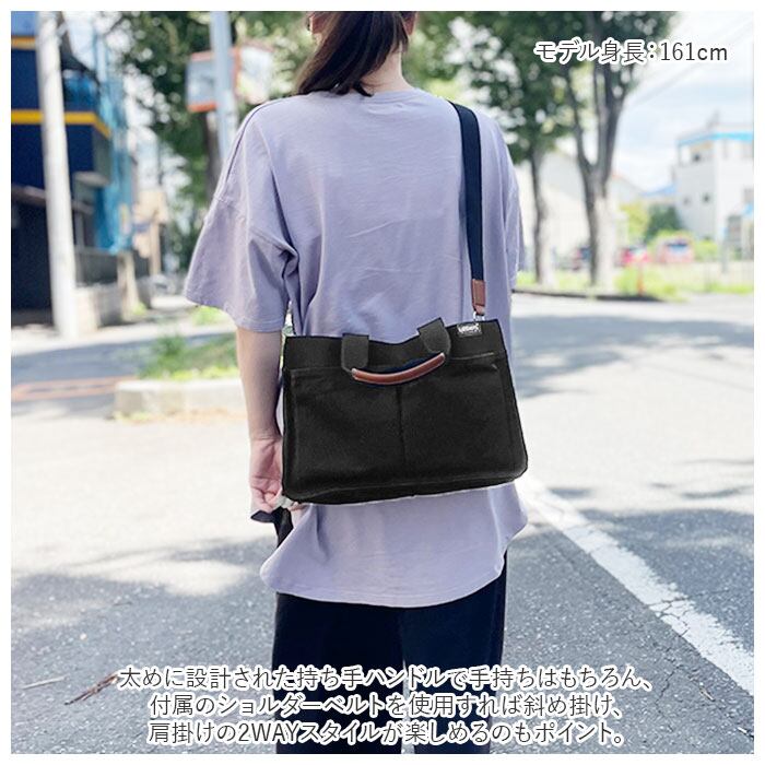 ・太めに設計された持ち手ハンドルで手持ちはもちろん、付属のショルダーベルトを使用すれば斜め掛け、肩掛けの2WAYスタイルが楽しめるのもポイント。