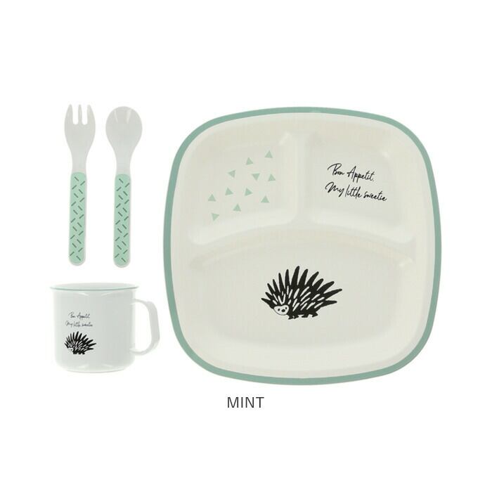 ・ランチプレート、キッズカップ、スプーン&フォークのセット。軽量で、落としてしまっても割れにくく丈夫な樹脂製。