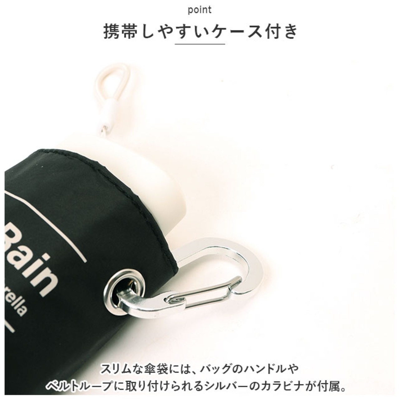 ・スリムな傘袋には、バッグのハンドルやベルトループに取り付けられるシルバーのカラビナが付属。