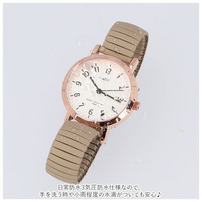 ・日本製ムーブメントを搭載。日常防水3気圧防水仕様なので、手を洗う時や小雨程度の水滴がついても安心♪