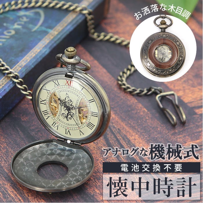 ・アンティーク調のレトロなムードが漂う懐中時計。蓋の一部が木目調デザインになっており、シックな印象を演出。