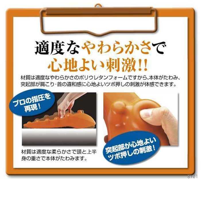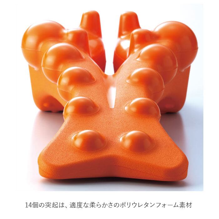・14個の突起は、適度な柔らかさのポリウレタンフォーム素材。頭と上半身の重みで本体がたわみ、まるでツボ押しのような刺激!