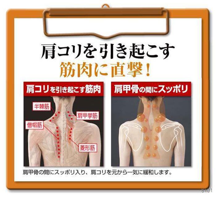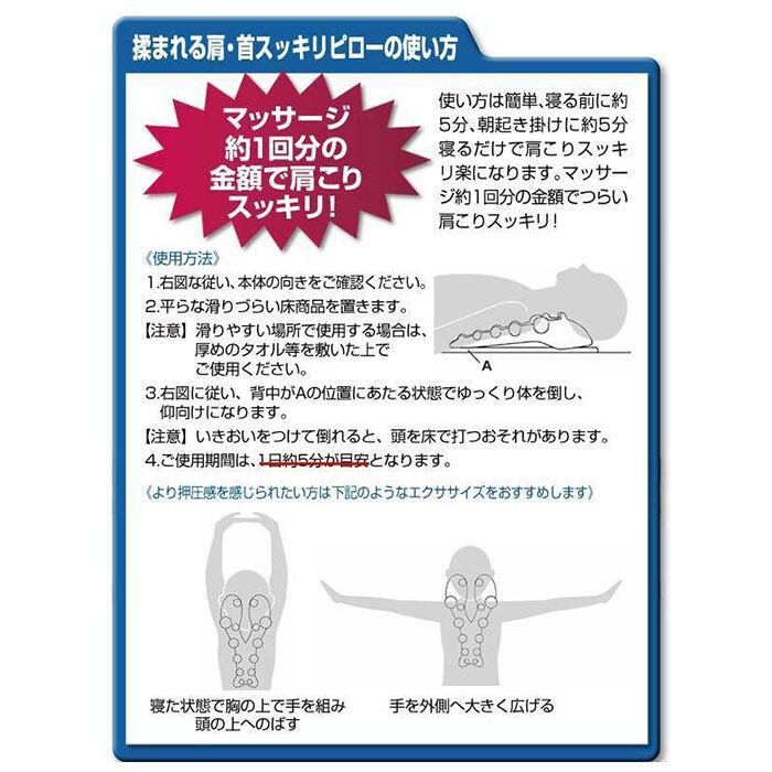 ・肩・首スッキリピローが肩甲骨の間にすっぽりと入り、首筋にフィット。波多野先生の施術理論を元に配置された14個の突起で、プロの指圧を受けているような感覚を味わえる。