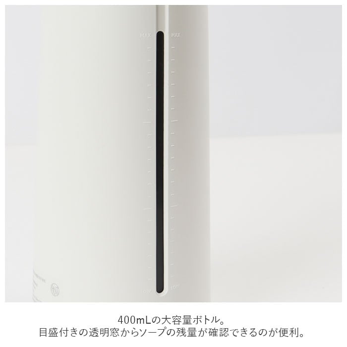 400mLの大容量ボトル。目盛付きの透明窓からソープの残量が確認できるのが便利。
