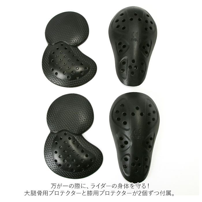 ・万が一の際に、ライダーの身体を守る!大腿骨用プロテクターと膝用プロテクターが2個ずつ付属。
