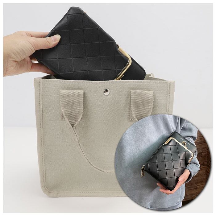・フロントのがま口には、リップや鍵など小物収納にピッタリ。