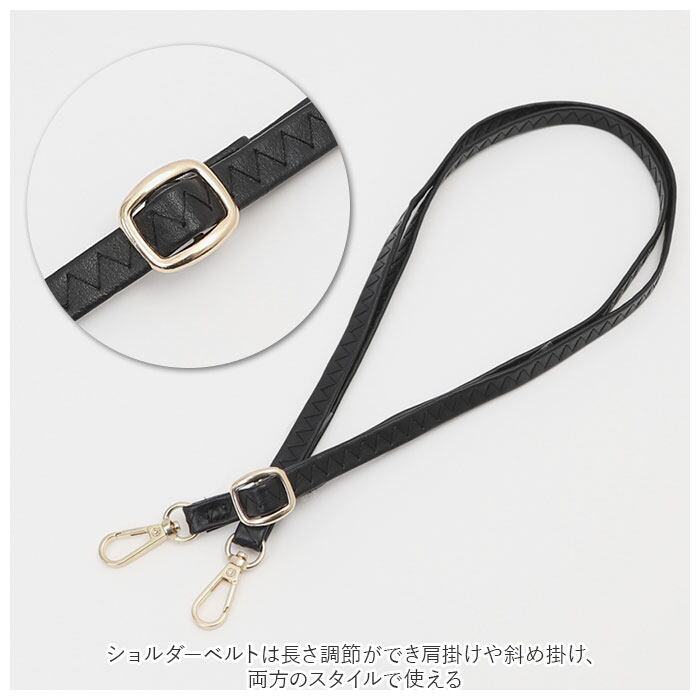 ・ショルダーベルトは長さ調節ができ肩掛けや斜め掛け、両方のスタイルで使える。