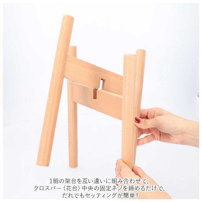 1組の架台を互い違いに組み合わせて、クロスバー(花台)中央の固定ネジを締めるだけで、だれでもセッティングが簡単!