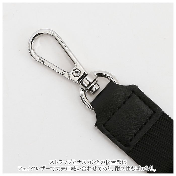 ・ストラップとナスカンとの接合部はフェイクレザーで丈夫に縫い合わせてあり、耐久性もばっちり。