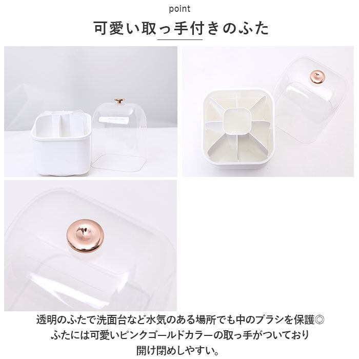 ・透明のふたで洗面台など水気のある場所でも中のブラシを保護◎ふたには可愛いピンクゴールドカラーの取っ手がついており、開け閉めしやすい。