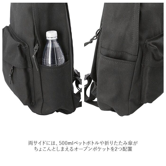 ・両サイドには、500mlペットボトルや折りたたみ傘がちょこんとしまえるオープンポケットを2つ配置。
