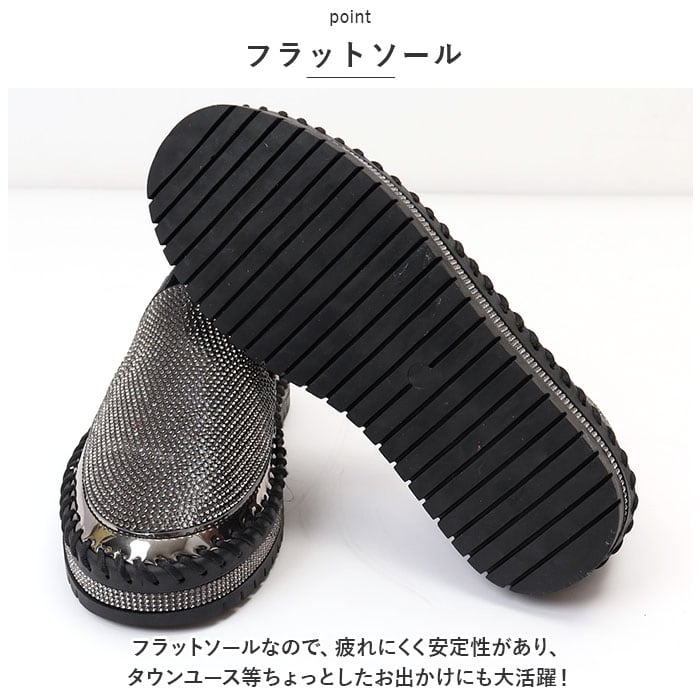 ・アッパーとソールのサイド部分にはラインストーン、光沢のあるエナメル調のアクセントで華やかな印象に。